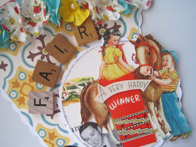 I have backed my circle piece in white and offset it's placement to create movement. Greeting card images I like best are what I call "scenery" cards. Not that they are a landscape, but that a scene of everyday life from a past era unfolds itself for you. Sigh! I love vintage. I have used flowers from my State Fair projects that were of a larger size and have mimicked the curve of my circle for my Scrabble tile placement.